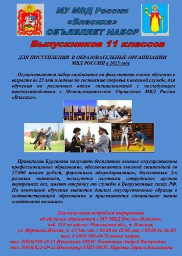 МУ МВД России «Власиха» объявляет набор выпускников 11 классов для поступления в образовательные организации МВД России в 2025 году