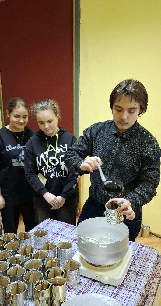 Участники мероприятия использовали картон и пустые жестяные банки, самостоятельно вырезая необходимые детали и заливая в них воск. Это не только увлекательный процесс, но и возможность прикоснуться к истории.