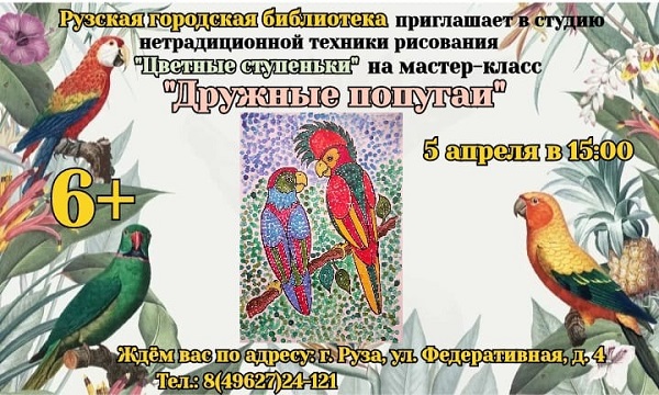 Мастер-класс «Дружные попугаи» состоится 5 апреля в 15 часов в студии нетрадиционной техники рисования «Цветные ступеньки» Рузской городской библиотеки.