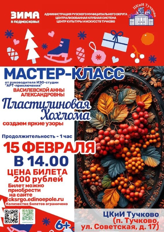 Центр культуры и искусств Тучково приглашает всех желающих на мастер-класс «Пластилиновая хохлома», 15 февраля в 14.00. Занятие организовано руководителем изостудии «Арт-приключения» Анной Василевской. Создайте отличное настроение, и смастерите невероятную поделку. Вы отвлечетесь от повседневности, проведете время в душевной творческой обстановке.