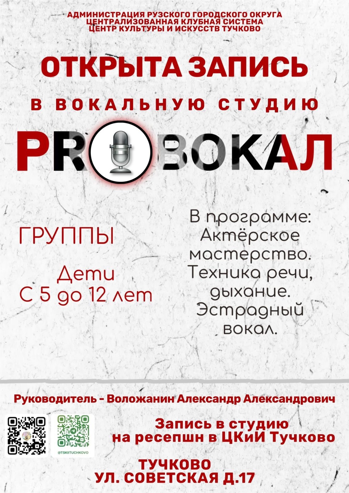 Запись в студию производится на ресепшн Тучковского ЦКиИ по адресу: улица Советская, дом 17.