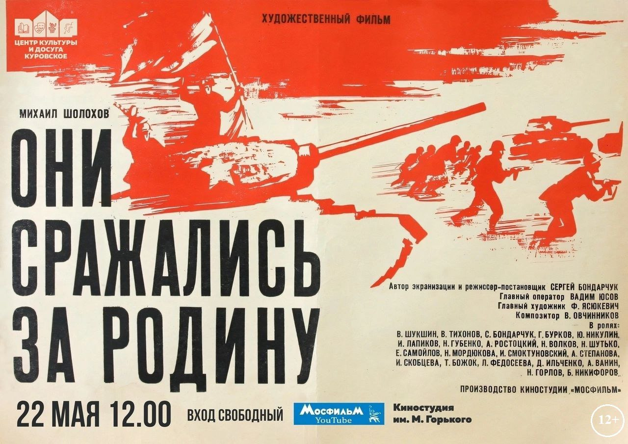 В среду в кинозале Центра культуры и досуга в городе Куровское покажут художественный фильм по одноимённому роману Михаила Шолохова «Они сражались за Родину» (режиссёр — Сергей Бондарчук).