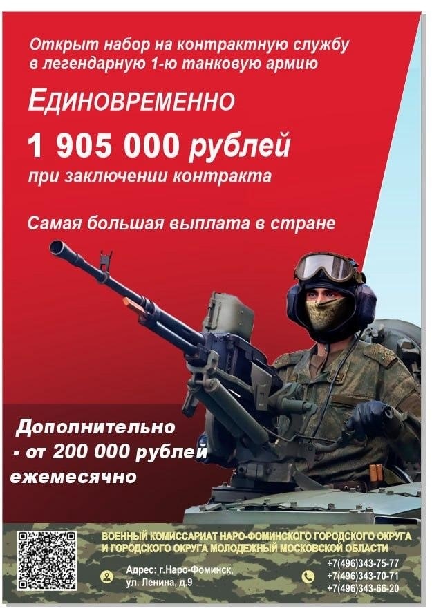 Жители Наро-Фоминского городского округа приглашаются на службу по контракту! Это уникальная возможность для граждан, которые хотят служить своей стране и получить за это достойное вознаграждение. Каждому контрактнику единовременно выплатят по 1 905 000 рублей, из которых 1 505 000 рублей составляют региональные выплаты, а 400 000 рублей — федеральные.