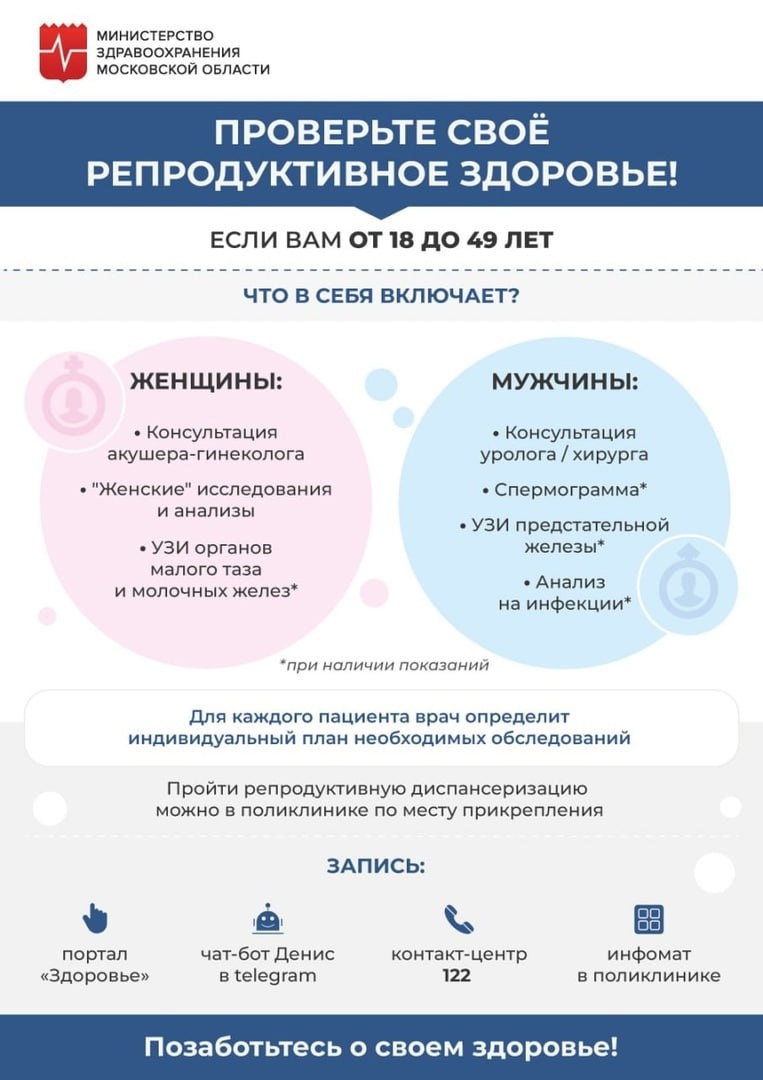 Репродуктивное здоровье — это возможность иметь детей. Проверить свое репродуктивное здоровье могут жители от 18 до 49 лет.